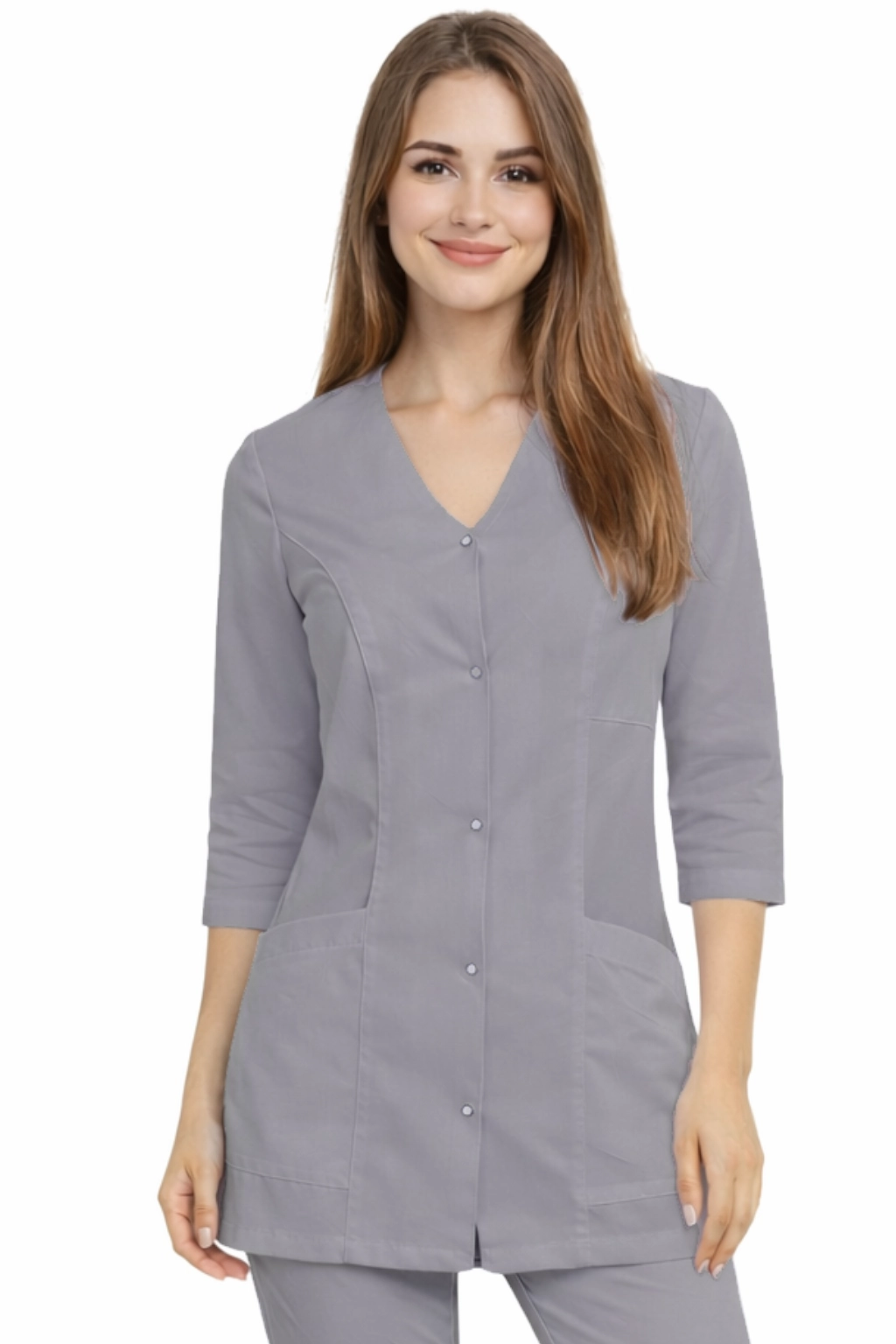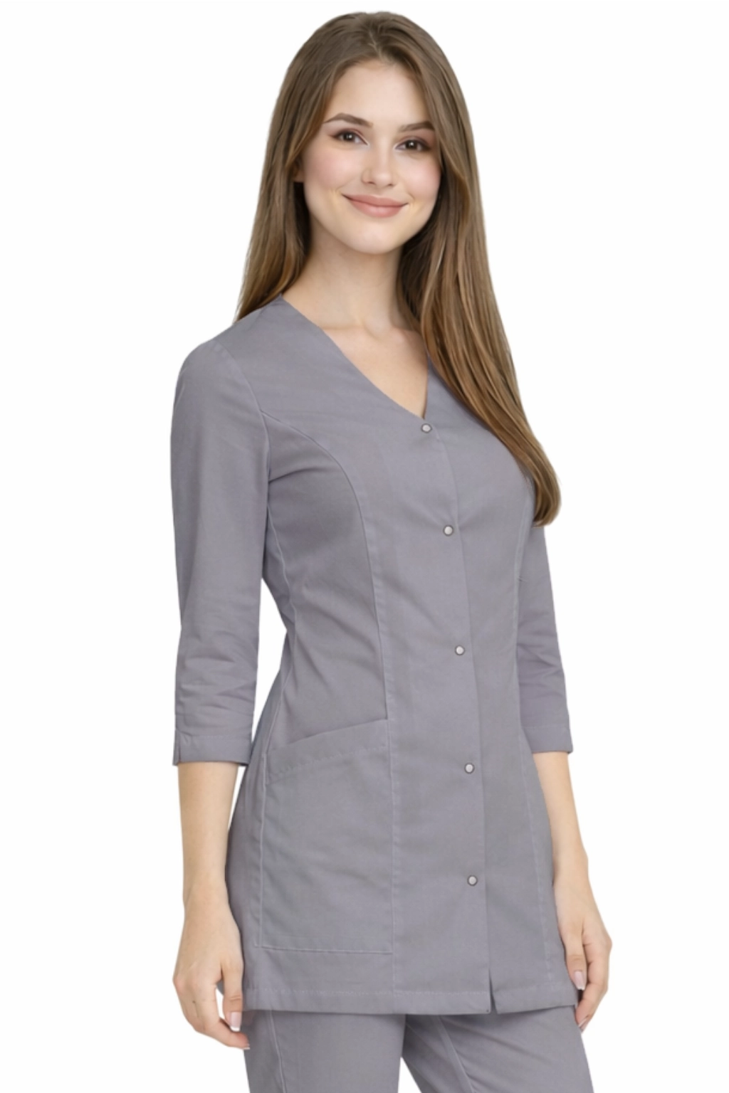Ženski medicinski jaket CASUAL PREMIUM v temno sivi barvi je eleganten in funkcionalen predlog za ženske, ki delajo v medicinski, kozmetični in lepotni industriji. Model združuje profesionalni videz z udobjem uporabe, zato se odlično obnese v zdravniških ordinacijah, klinikah estetske medicine, kozmetičnih salonih, SPA-jih ali na recepciji.