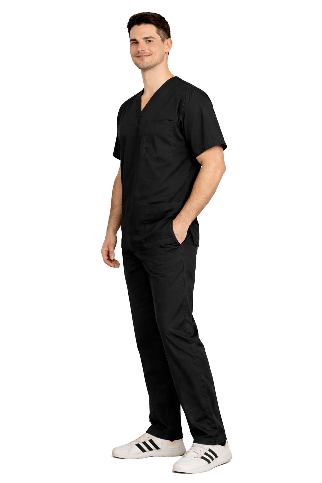 Moški medicinski komplet 100% bombaž v črni barvi je klasičen, univerzalni komplet namenjen medicinskemu osebju – kirurgom, zdravnikom, medicinskim sestram in rehabilitacijskim terapevtom. Naravna tkanina s gramaturo 155 g/m² zagotavlja vzdržljivost in udobje skozi ves dan, ne da bi omejevala svobodo gibanja. Oblačila ohranijo intenzivno barvo in stabilno velikost tudi po več pranjih.