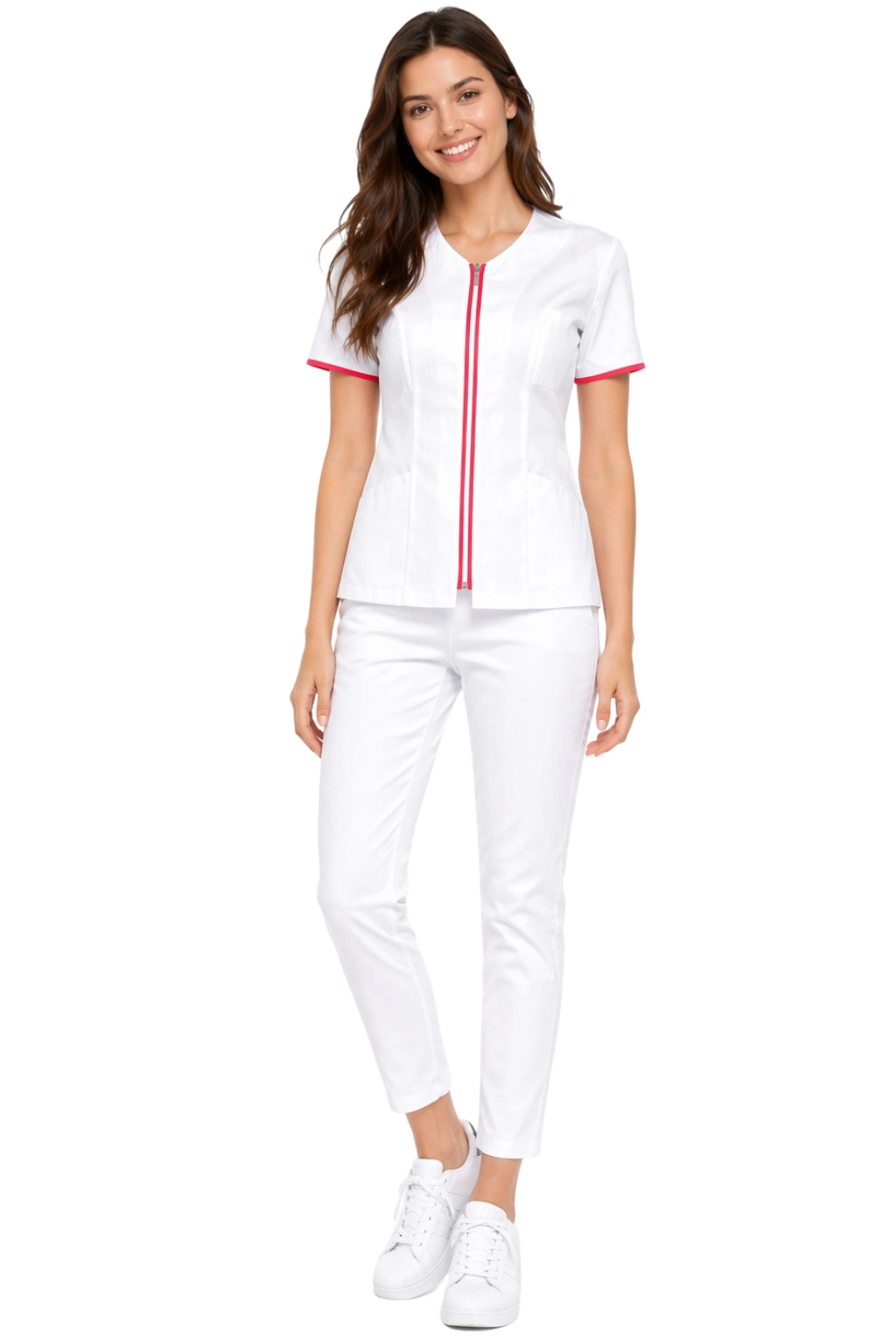 Komplet medicinskega suknjiča na zadrgo in cigaretnih hlač je eleganten in funkcionalen komplet medicinske oblačil za ženske, ki cenijo profesionalen videz in udobnost dela. Bel suknjič z amarantovo obrobo v kombinaciji z belimi hlačami tipa cigaretna hlača ustvarja stilsko in moderen medicinski uniformi.