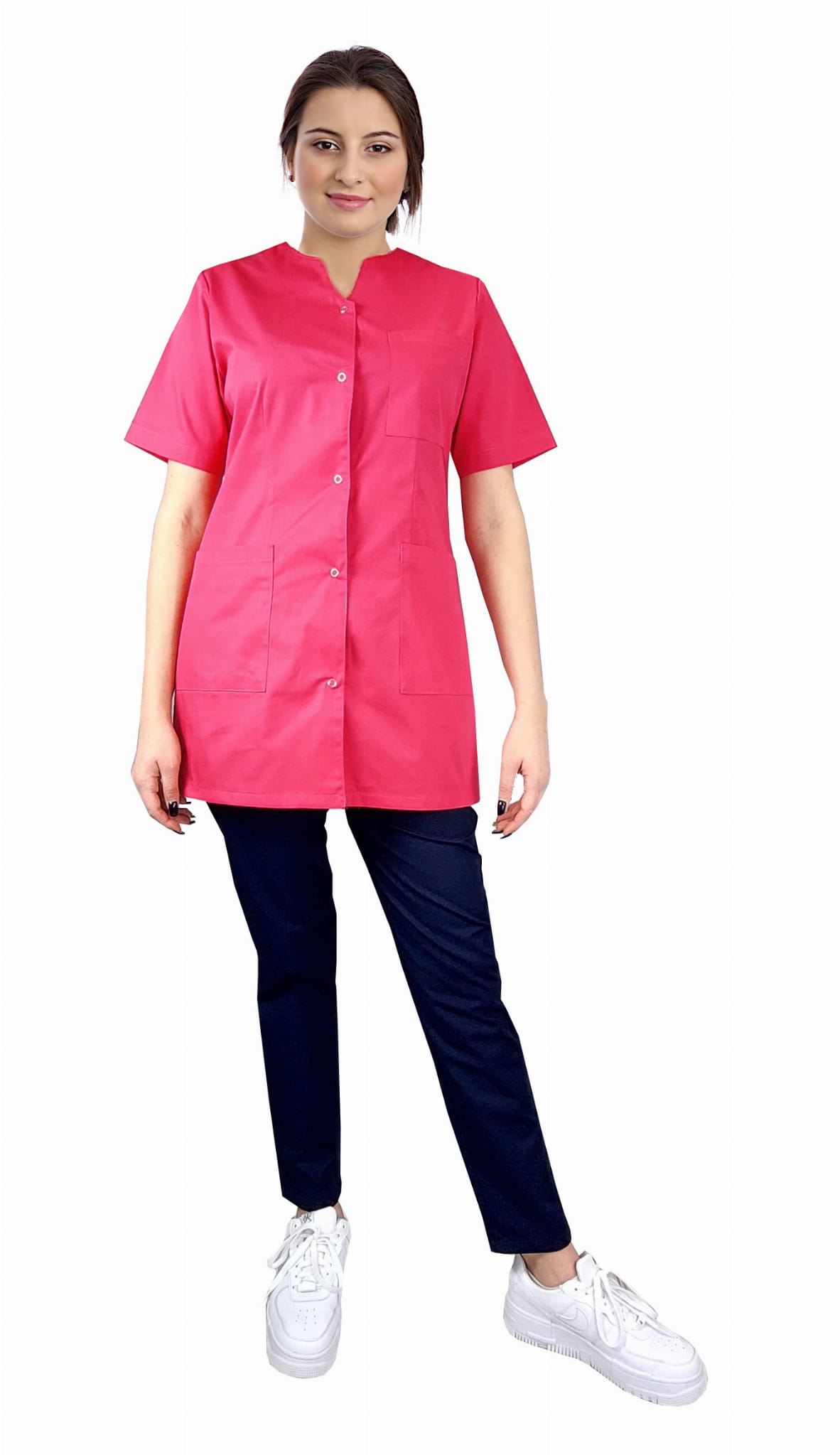 Ženski medicinski komplet – jopič na pritiskače in cigaretne hlače je stilski in funkcionalni set medicinske obleke, namenjen ženskam, ki delajo v medicinski, kozmetični in storitveni industriji. Kombinacija elegantnega amarantnega jopiča z mornarsko modrimi hlačami ustvarja sodobno in profesionalno uniformo za delo.