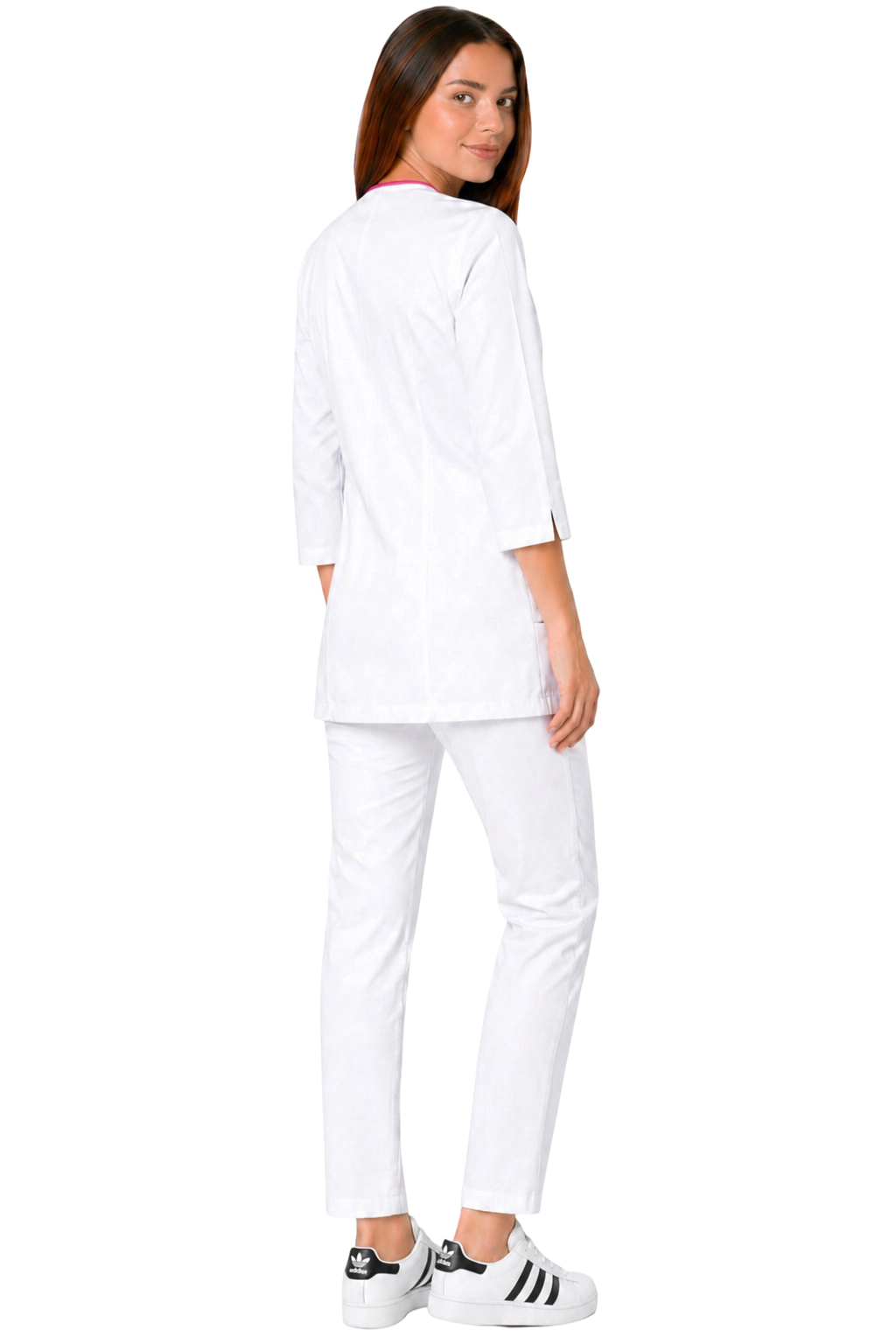 Ženski medicinski komplet bel – 3/4 rokav jakna in hlače PHARMACY COMFORT so odlična izbira za strokovnjakinje na področju medicine in kozmetike. Naš edinstveni komplet združuje elegance s funkcionalnostjo, zagotavlja udobje med vsakodnevnim delom. Jakna, ki se zapenja na prednji strani, z estetskim okrasjem, se odlično ujema z udobnimi cigaret hlačami, ki poudarijo silhueto. Ustvarjen za lekarne, farmacevte, optike in registracijsko osebje, naša uniforma se bo odlično obnesla tudi v rokah medicinskih sester, kozmetičark in frizerov. Izberite udobno in stilsko obleko, ki vam bo olajšala vsakodnevne izzive!