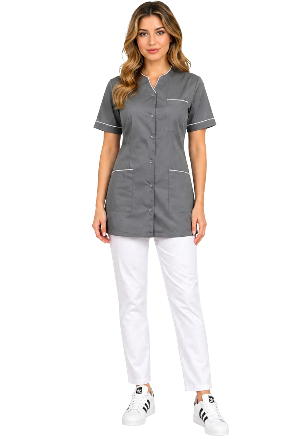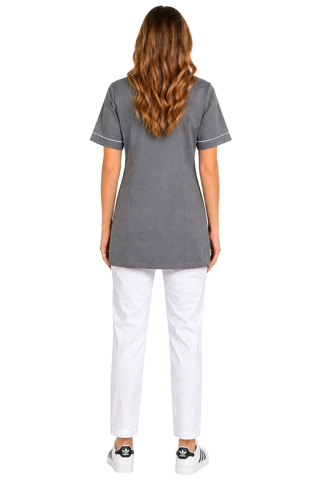 Ženski medicinski komplet sivi in beli – sivi žaket z belim robom in hlače PHARMACY COMFORT