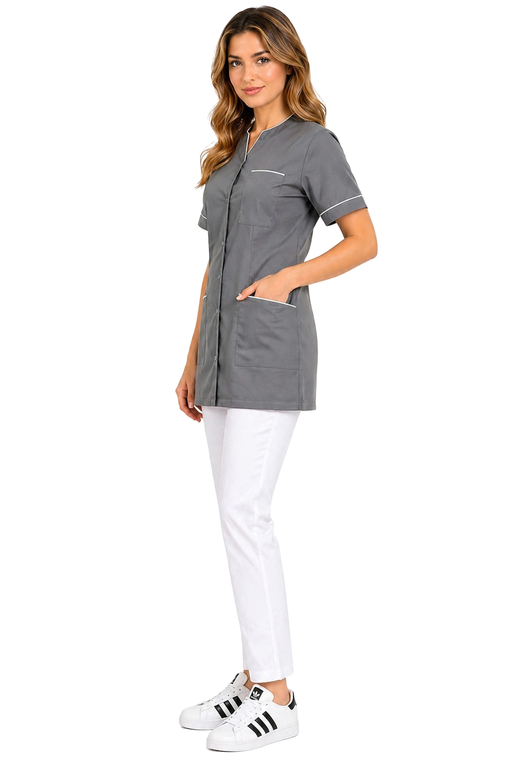 Ženski medicinski komplet siva bela – jakna in hlače PHARMACY COMFORT so odlična izbira za profesionalke v medicini in kozmetiki. Naš edinstven komplet združuje eleganco z funkcionalnostjo, zagotavlja udobje med vsakodnevnim delom. Jakna z zapenjanjem spredaj, z estetskim obrobljanjem, se idealno ujema s prijetnimi cigaret hlačami, ki poudarjajo silhueto. Izdelan z mislijo na lekarne, farmacevte, optike in registracijsko osebje, bo naša uniforma prav tako koristna v rokah medicinskih sester, kozmetičark in frizerk. Izberite udoben in stilski kostum, ki vam bo olajšal vsakodnevne izzive!