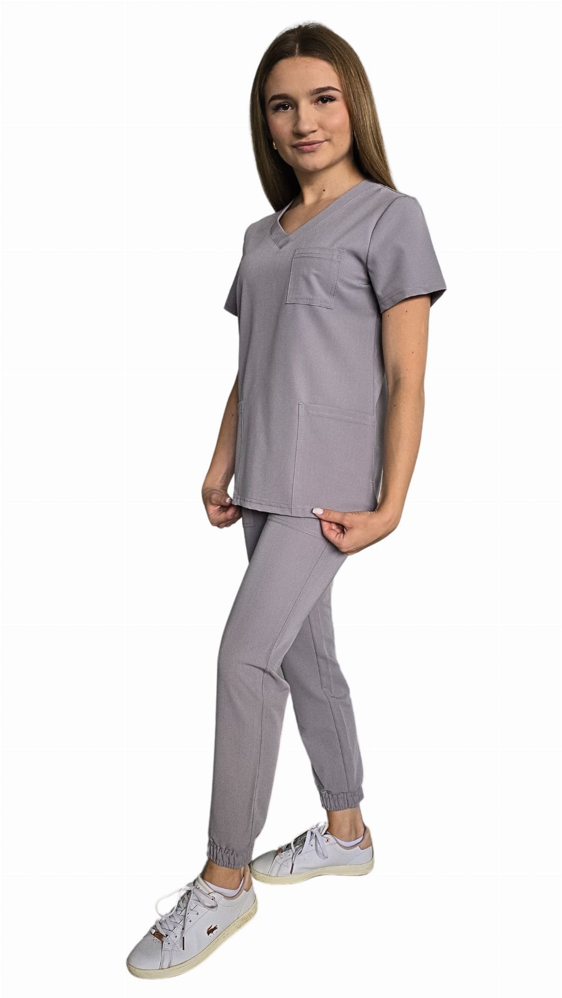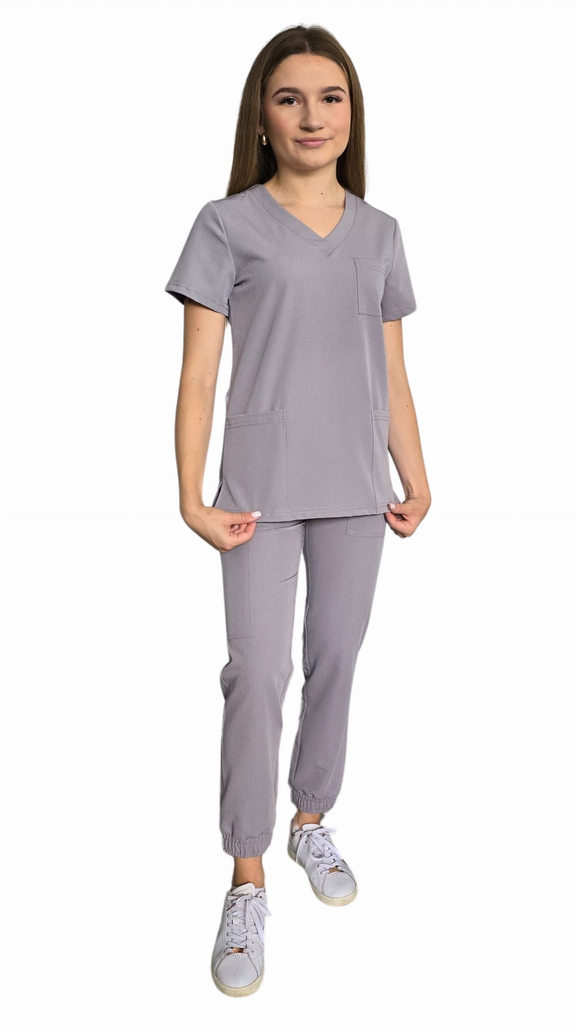 Damski medicinski komplet CASUAL PREMIUM v temno sivi barvi je idealna kombinacija funkcionalnosti, udobja in sodobnega sloga. Komplet sestavlja prilagojena medicinska majica in udobne jogging hlače, ki skupaj tvorijo profesionalno medicinsko uniformo, ki zagotavlja udobje med dolgotrajnim delom.