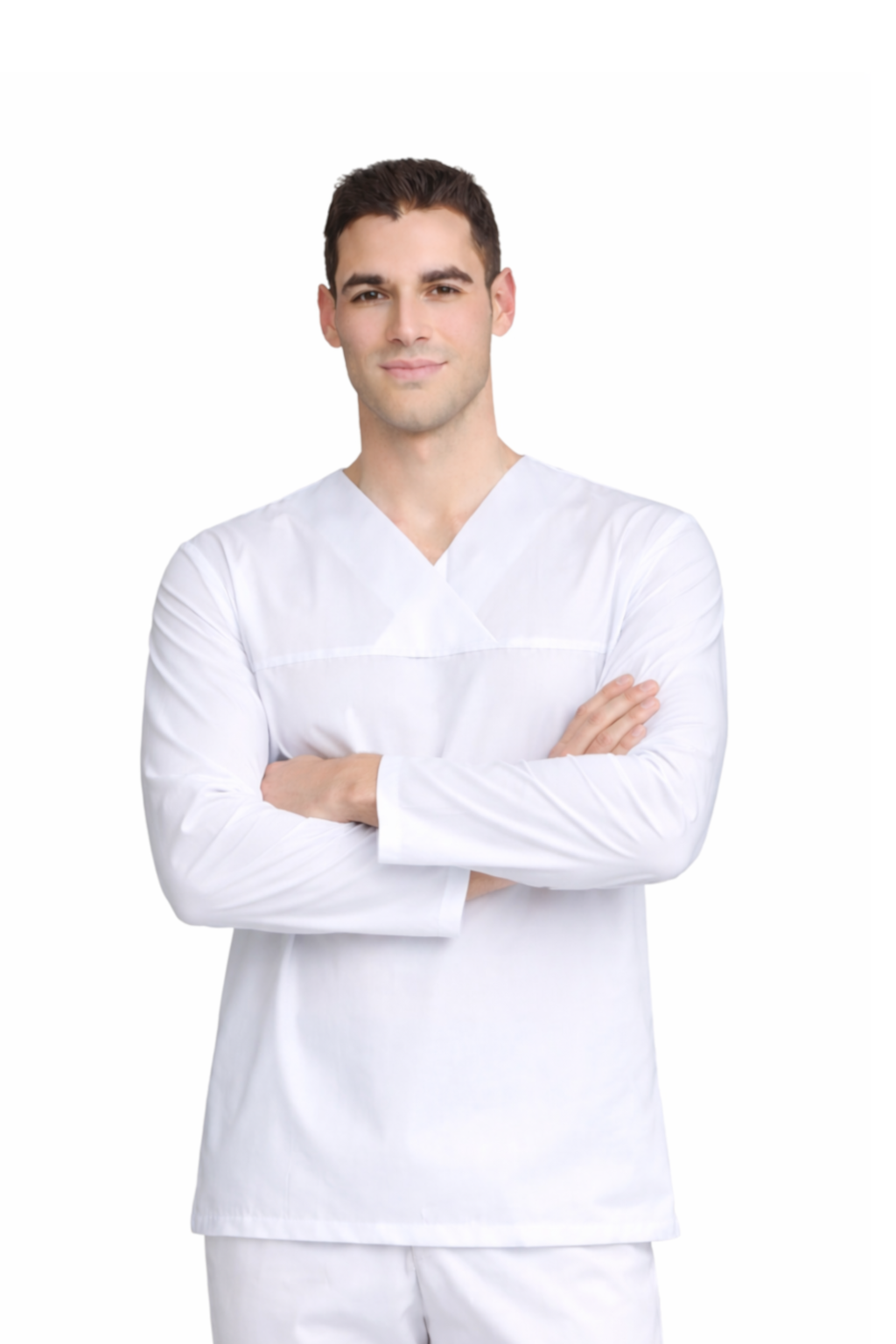 - Klasična medicinska bluza z dolgimi rokavi, enostavna za nosenje preko glave.