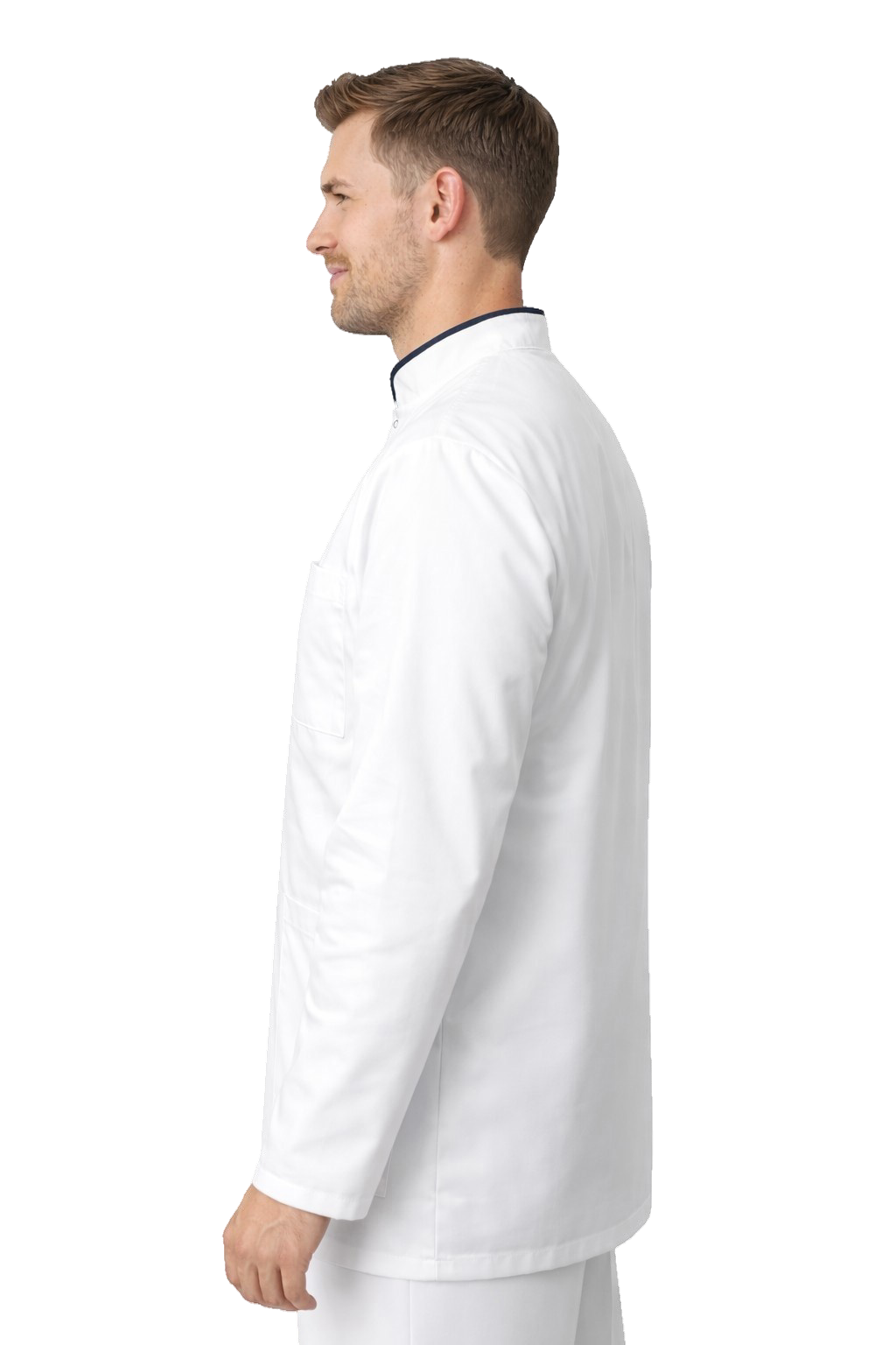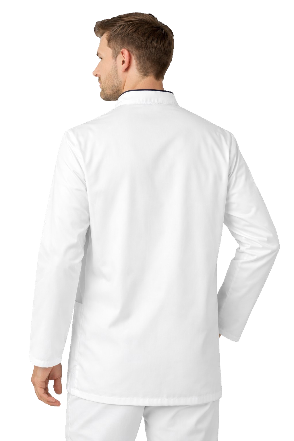 Bela moška zdravstvena / medicinska jakna z mornarsko modrim ovratnikom