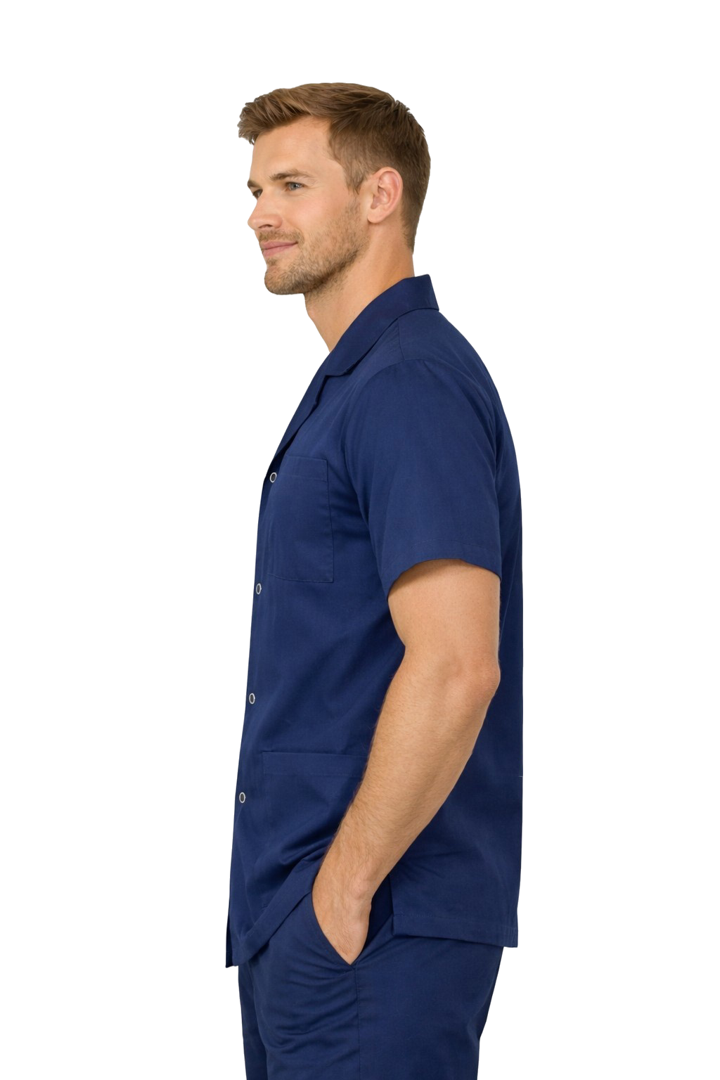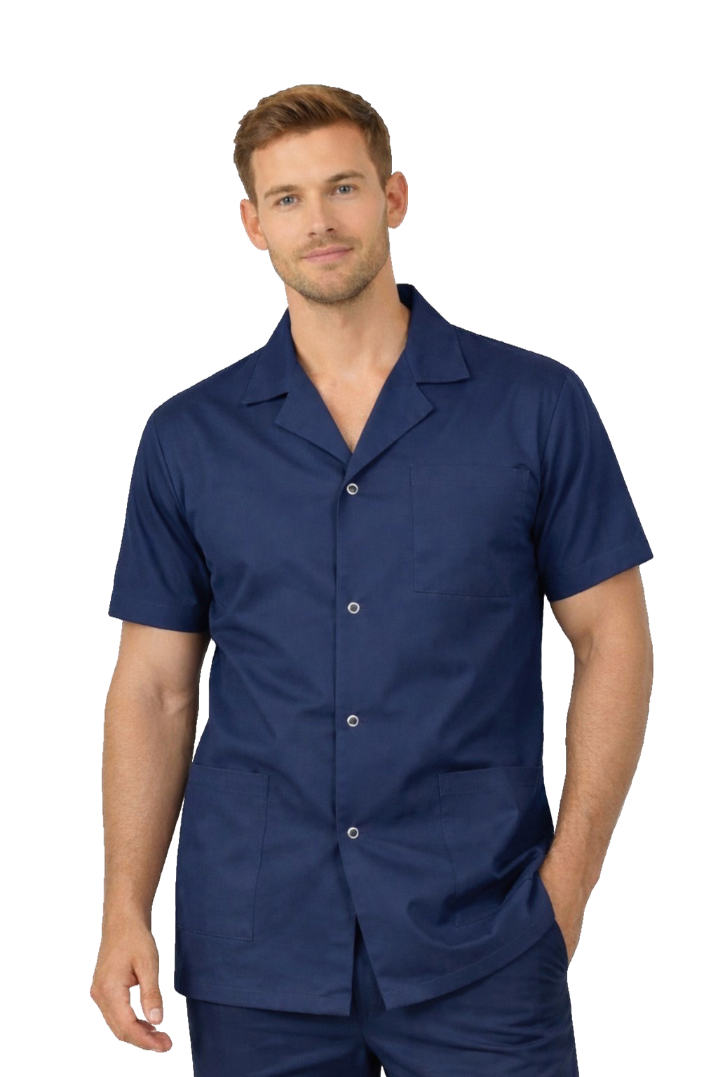 Odkrijte našo elegantno moško medicinsko srajco z ovratnikom in kratkimi rokavi, ki združuje udobje s profesionalnim videzom. Izdelano z mislijo na zdravnike, medicinske sestre in delavce v lepotni industriji, ta mornarsko modra srajca zagotavlja ne samo slog, ampak tudi funkcionalnost. Izdelana iz visokokakovostnega materiala, zagotavlja trajnost, udobje nošenja in ohranja obliko tudi po večkratnem pranju. Izberite našo srajco in poudarite svoj profesionalizem v vsakdanjem delu.