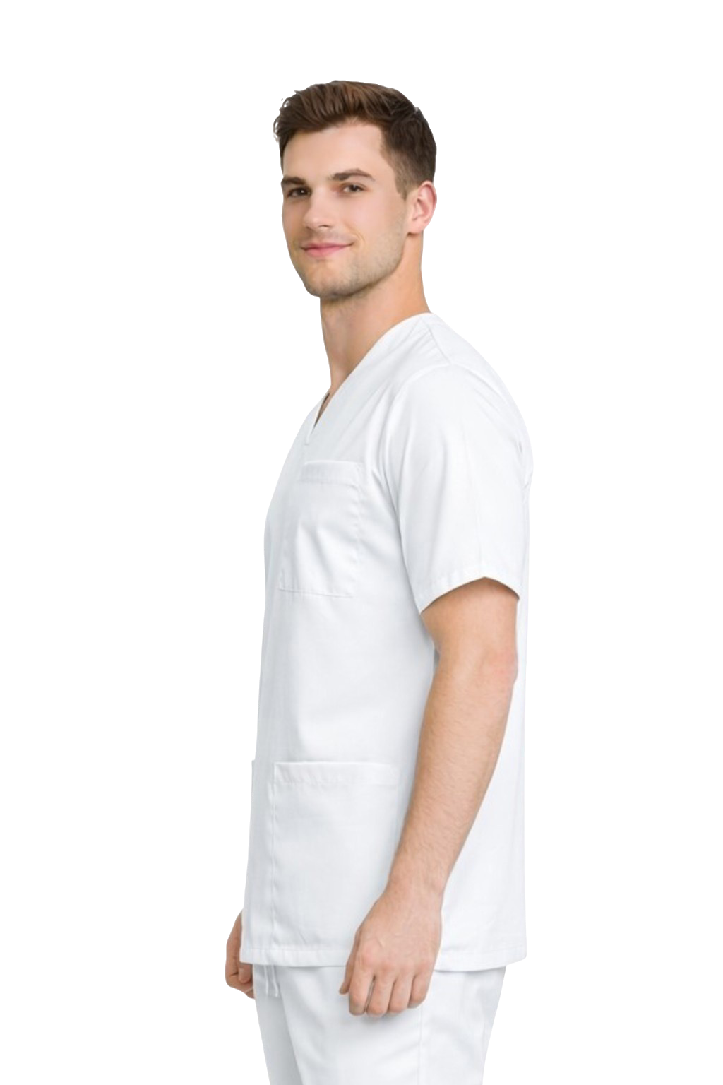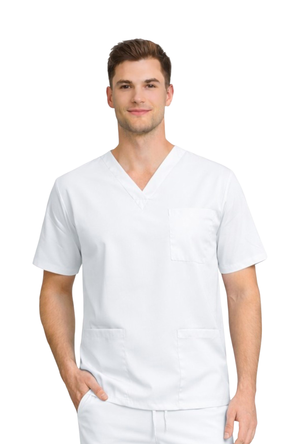 Bela moška medicinska bluza SLIM je moderna in udobna medicinska oblačila, oblikovana z mislijo na zdravnike, medicinske sestre, zobozdravnike, fizioterapevte, veterinarje in študente medicinskih smeri. Zahvaljujoč vitkemu kroju SLIM se bluza odlično prilagaja postavi, prožen material z dodatkom elastana pa zagotavlja svobodo gibanja in udobje pri delu.