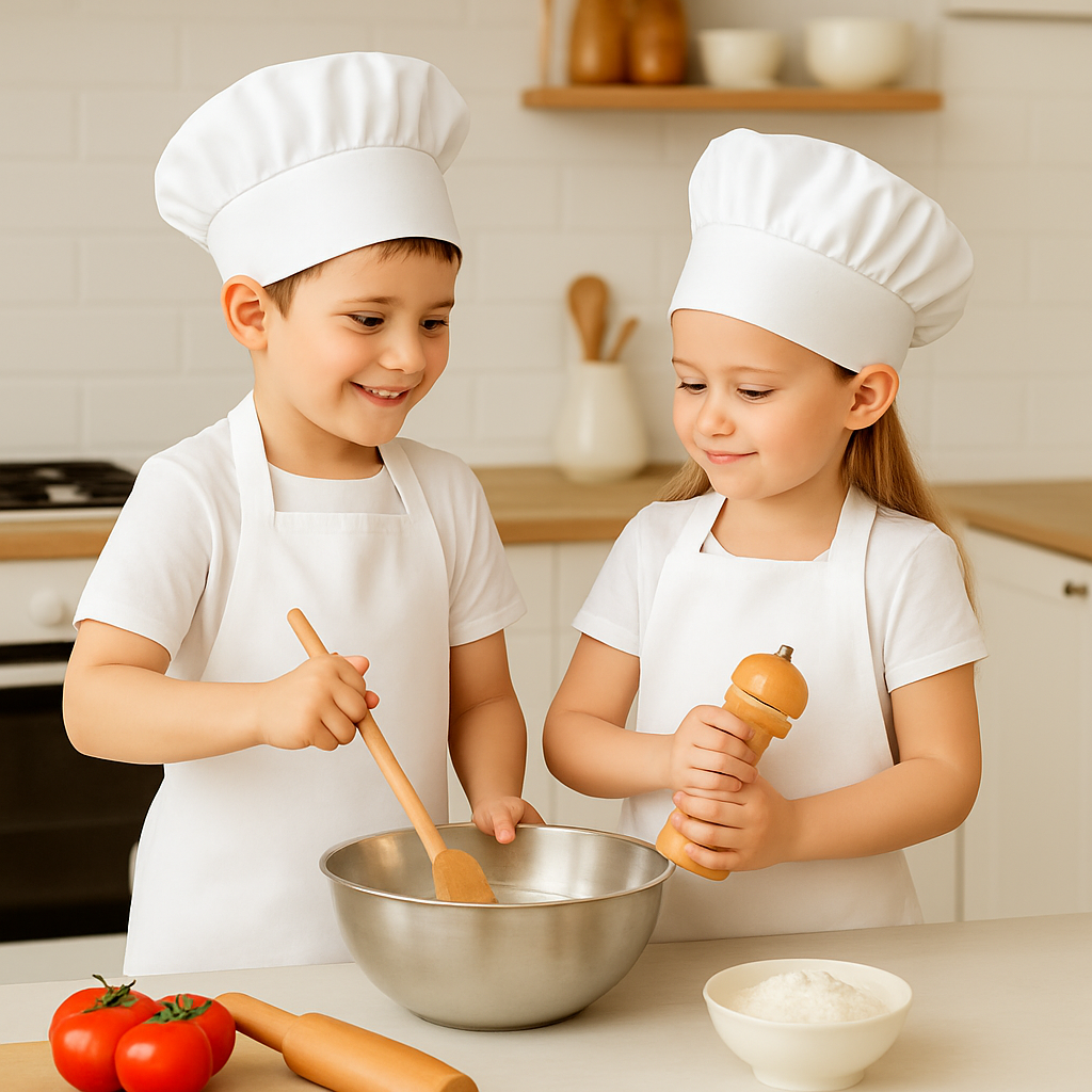 Ponavljalna in kapa sta zasnovani z mislijo na najmlajše kuharje. Komplet je primeren tako doma kot tudi na kulinaričnih aktivnostih, saj podpira razvoj strasti in domišljije.