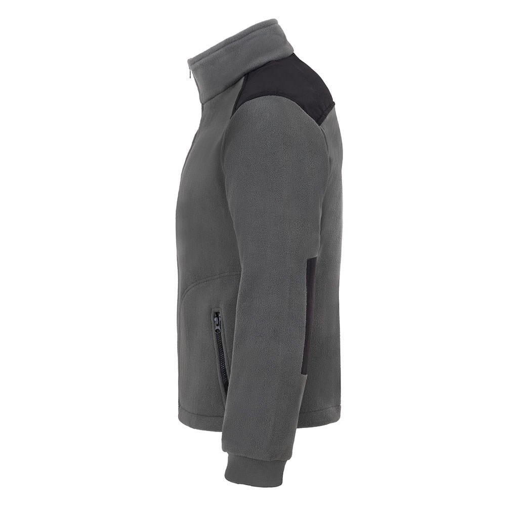Siva barva v kombinaciji s črnimi vstavki daje jakni sodoben in stilski značaj. Možnost kombiniranja barv pomeni, da se model odlikuje od klasičnih flisov.