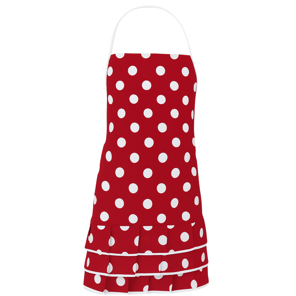 Vnesite malo veselja in barve v svojo kuhinjo s kuhinjskim predpasnikom v belih pikah. Model je na voljo v različici za odrasle in otroke, zato je odlična izbira za družinski komplet.