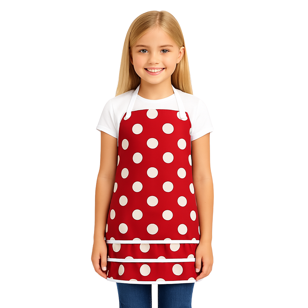 Vnesite več veselja v kuhinjo z otroškim kuhinjskim predpasnikom rdečim z belimi pikami. Odličen za male kuharje, ki obožujejo pomoč pri kuhanju, peko piškotov ali ustvarjanje kreativnih jedi. Barvit in funkcionalen, bo vsak otrokovo kuhanje spremenil v posebno zabavo.