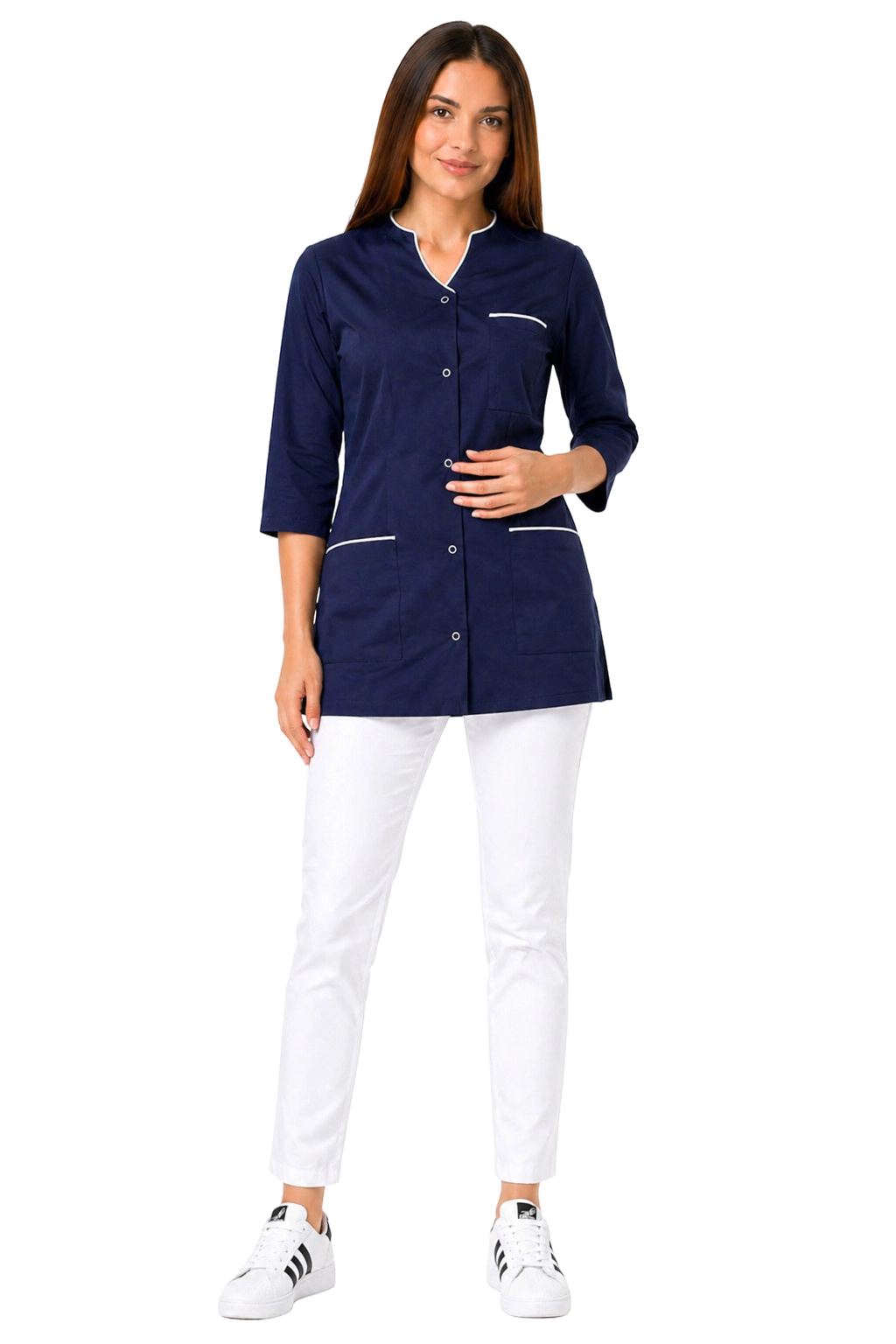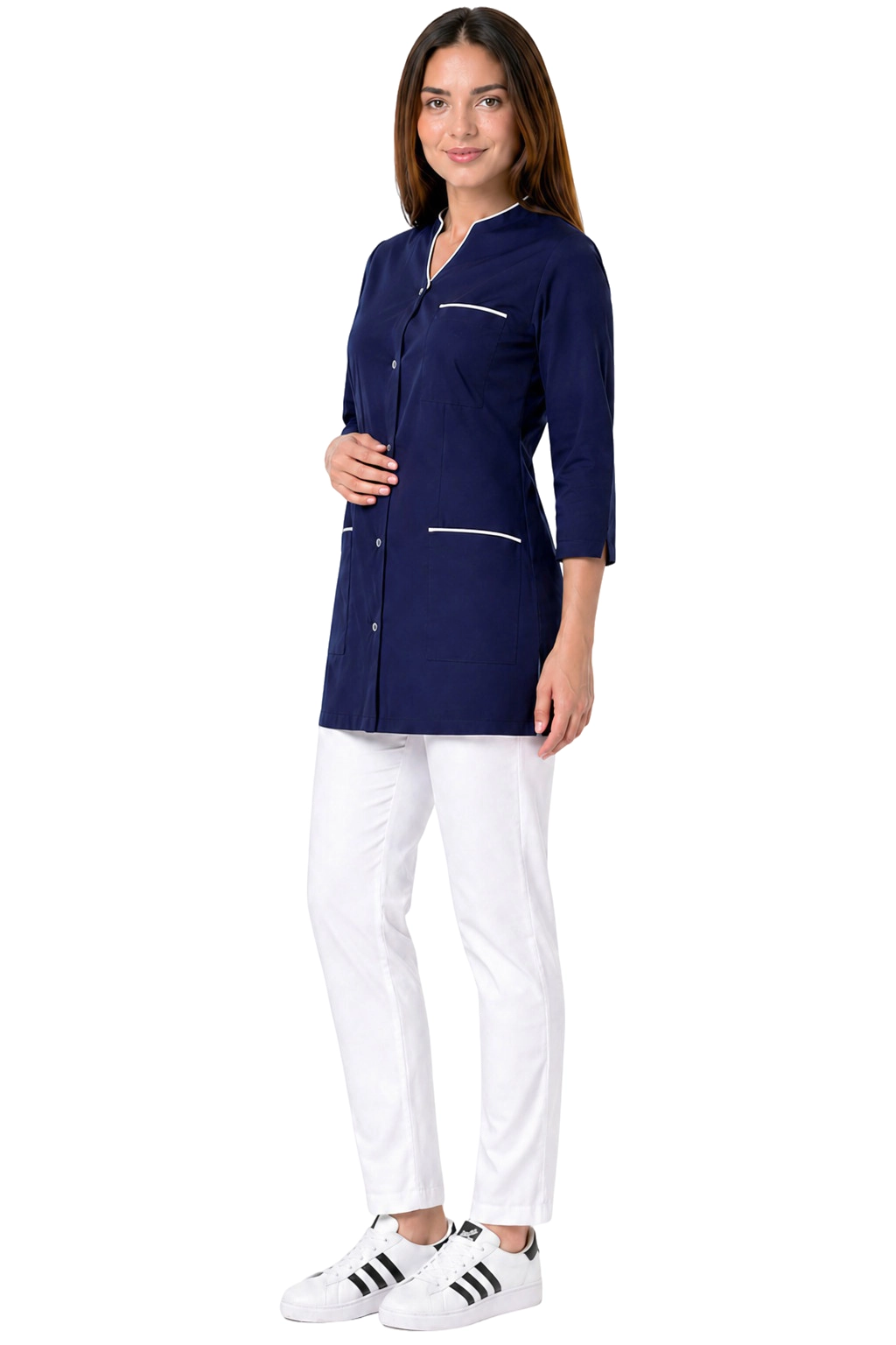 Komplet medicinski ženski marin modro-beli – jakna 3/4 rokava s belim robom in hlače PHARMACY COMFORT