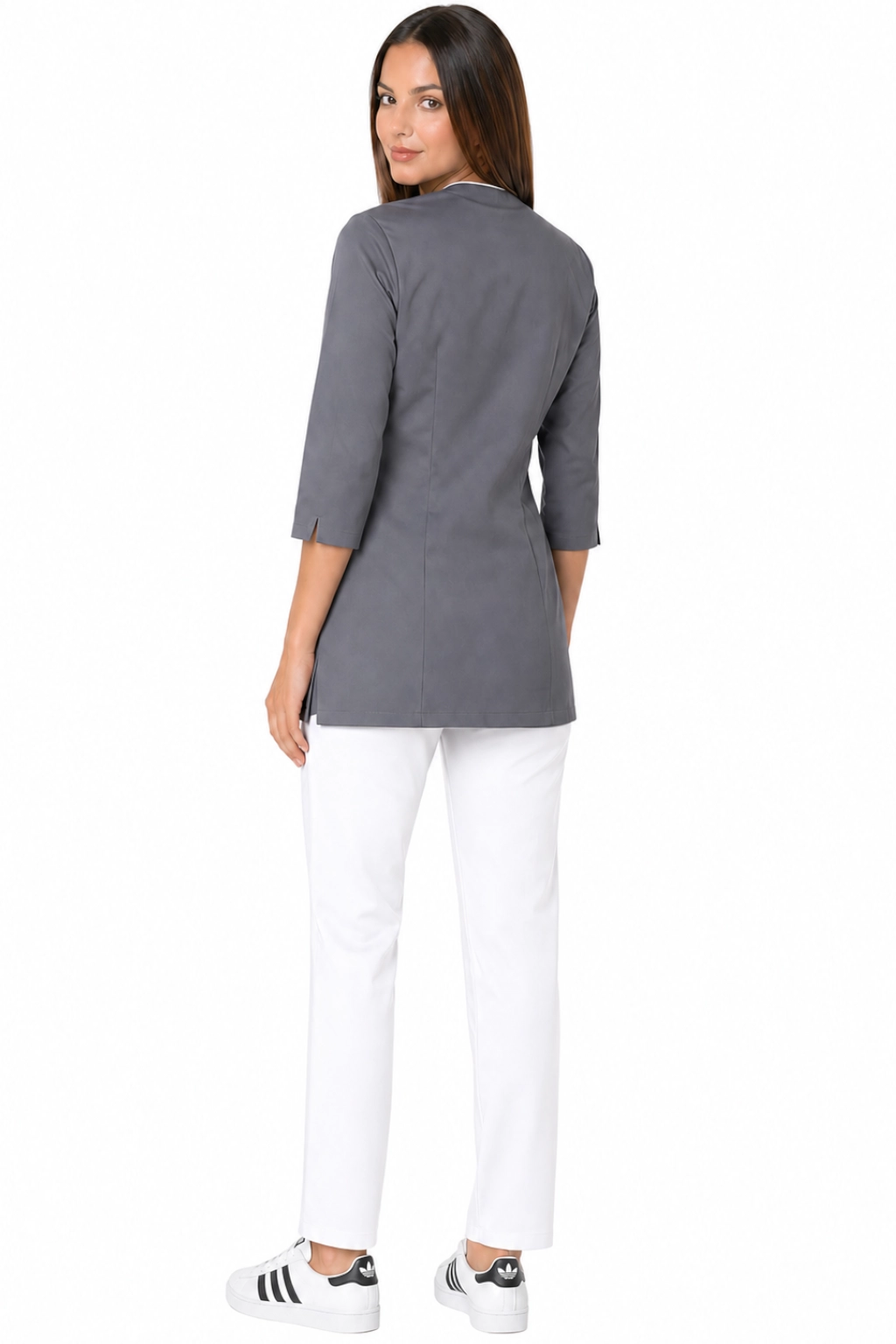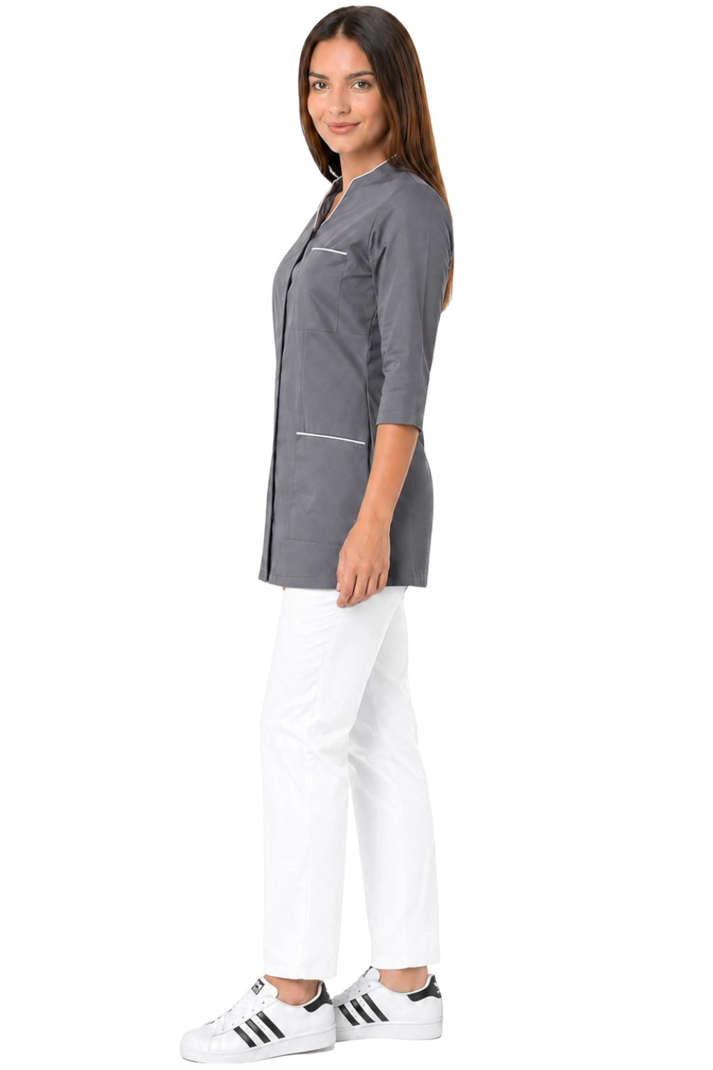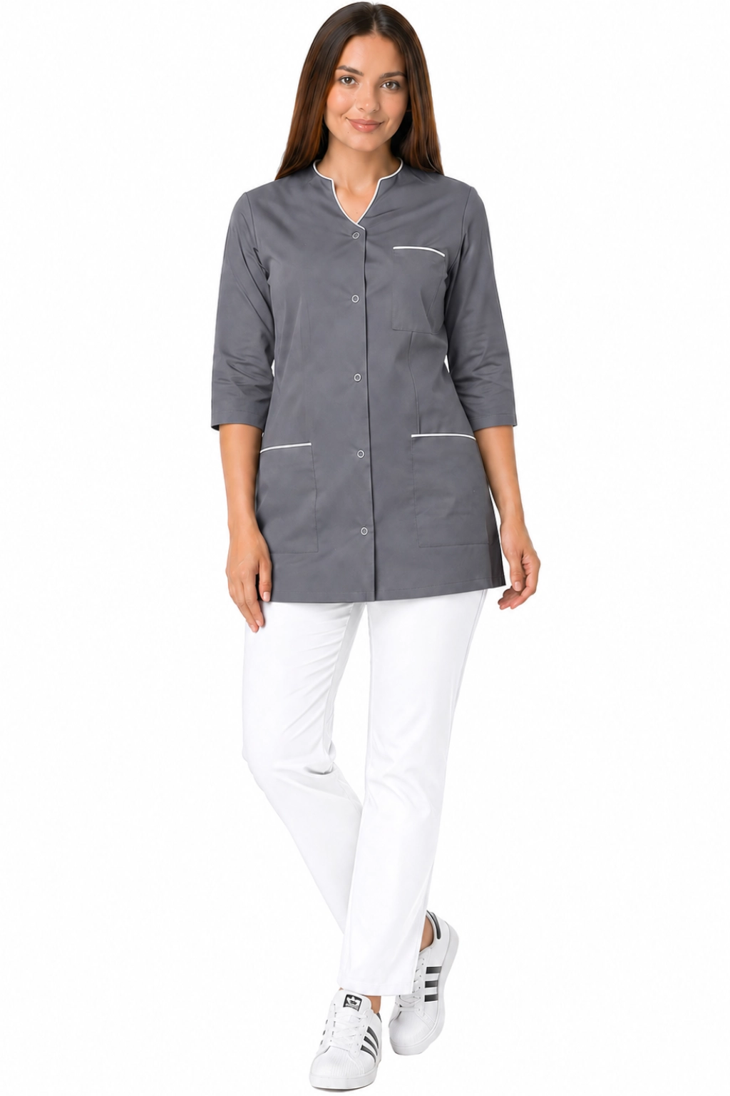 Ženski medicinski komplet siva in bela – 3/4 rokavi in hlače PHARMACY COMFORT je odlična izbira za profesionalke v medicini in kozmetiki. Naš edinstven komplet združuje eleganco z funkcionalnostjo, zagotavljajoč udobje med vsakodnevnim delom. Jakna na sprednjo zadrgo z estetskim obrobljanjem se popolnoma ujema z udobnimi cigaret hlačami, ki poudarijo postavo. Naša uniforma je bila ustvarjena za lekarne, farmacejte, optike ter za recepcijske delavce, primeren je tudi za medicinske sestre, kozmetičarke in frizerke. Izberite udobno in stilsko obleko, ki vam bo olajšala vsakodnevne izzive!