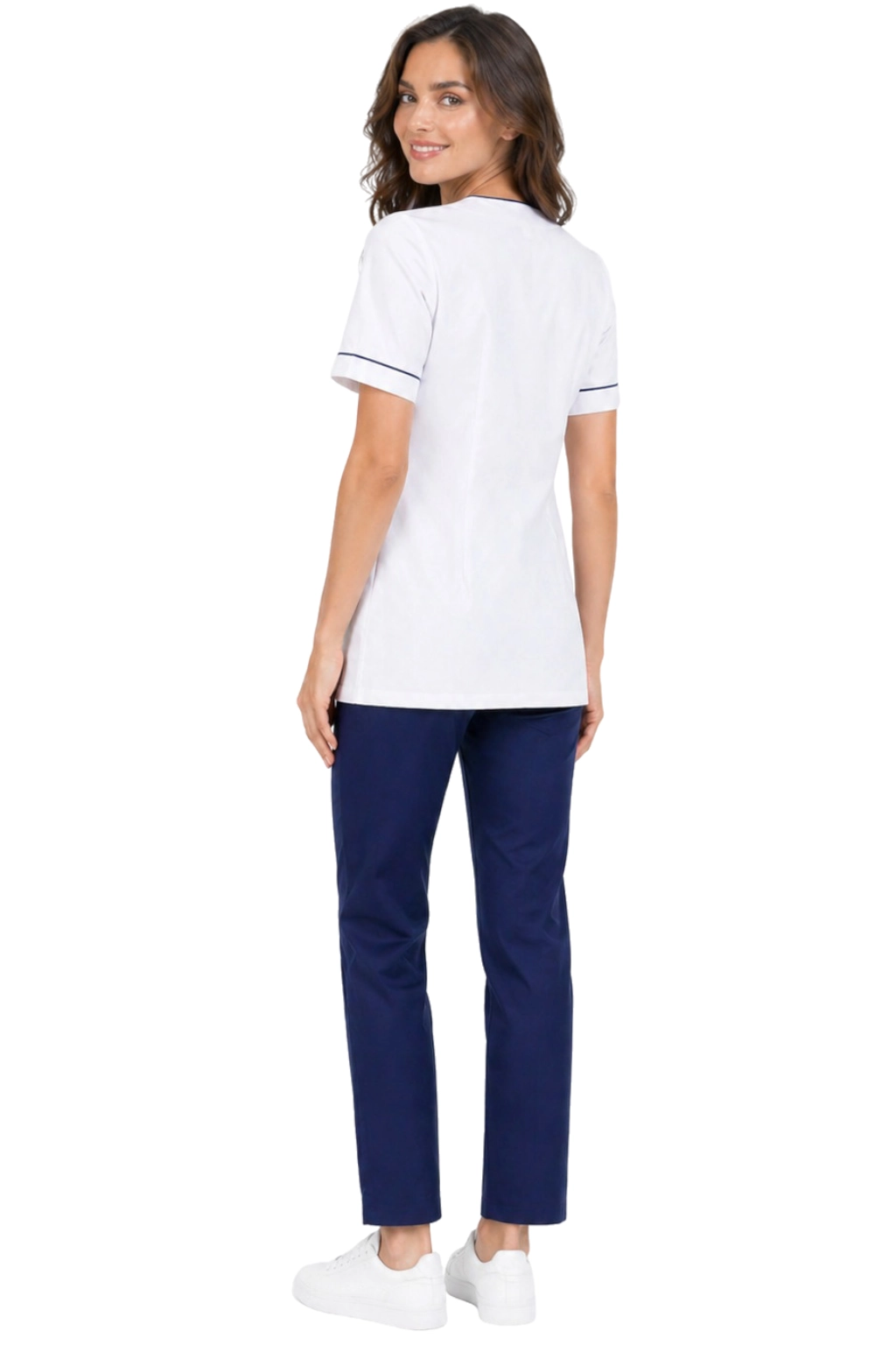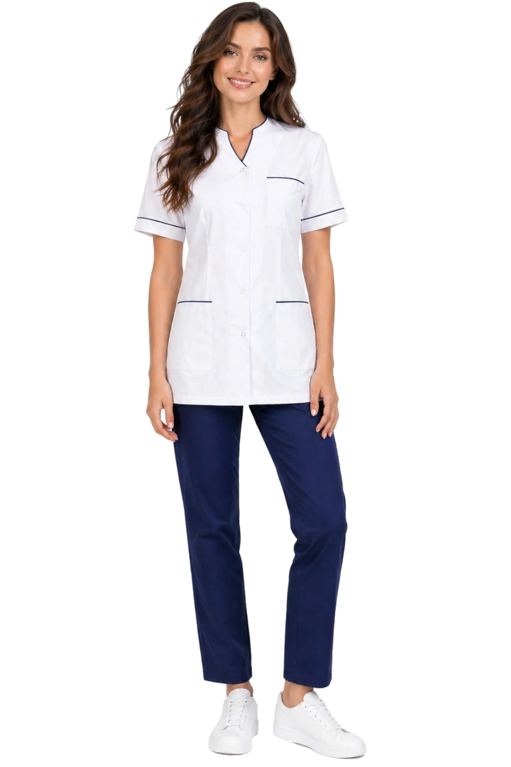 Ženski medicinski komplet bel z mornarsko modrim robom - jakna in hlače PHARMACY COMFORT so odlična izbira za profesionalke v medicini in kozmetiki. Naš edinstven komplet združuje eleganco s funkcionalnostjo, zagotavljajoč udobje med vsakodnevnim delom. Spredaj zapeta jakna z estetskim robom popolnoma sovpada s udobnimi cigaretnimi hlačami, ki poudarijo postavo. Ustvarjen za lekarne, farmacevte, optike in registracijsko osebje, se bo naša uniforma izkazala tudi v rokah medicinskih sester, kozmetičark in frizerjev. Izberite udobna in stilsko oblačila, ki vam bodo olajšala vsakodnevne izzive!