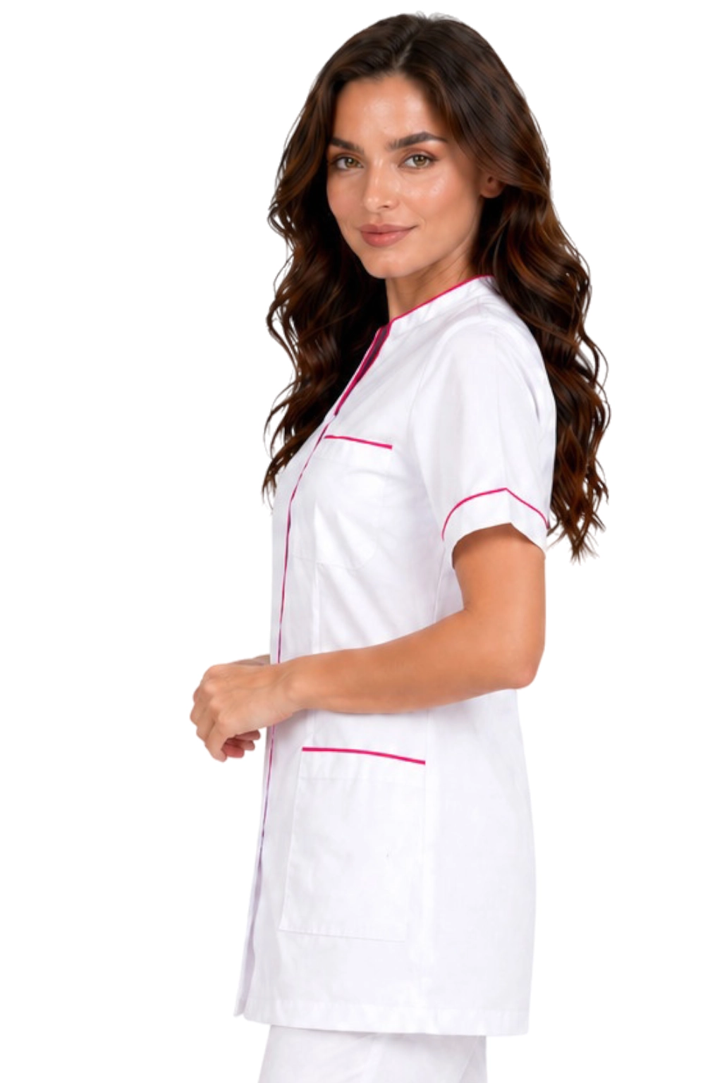 Ženski medicinski kozmetični žaket bel z amarantno obrobo plašč.